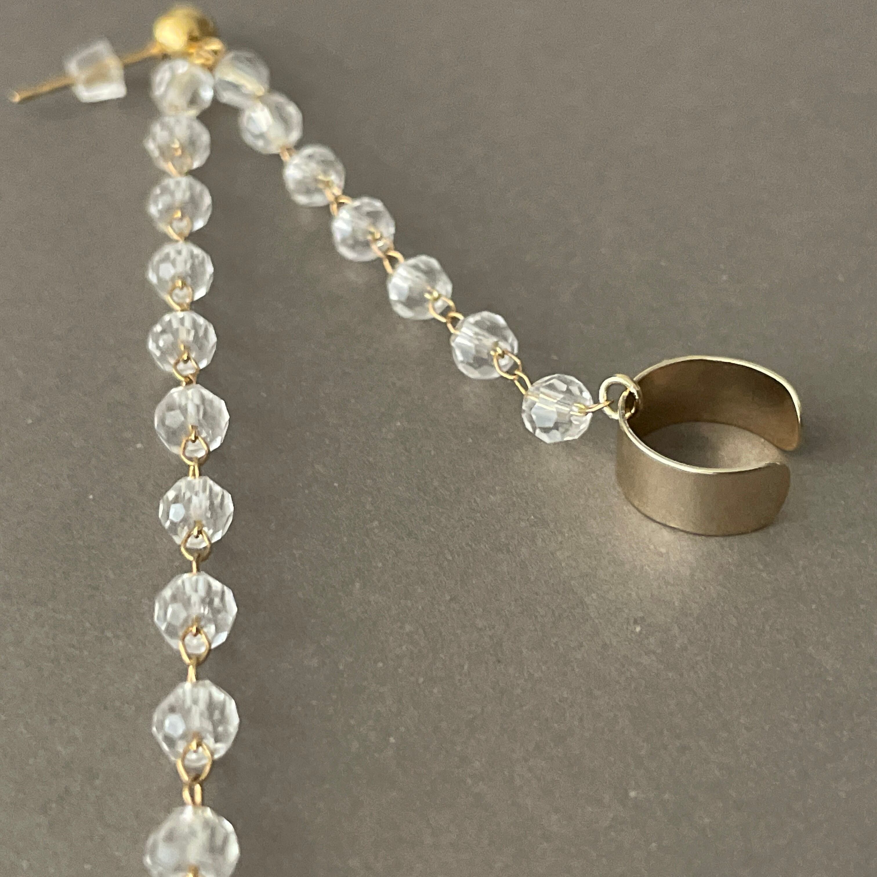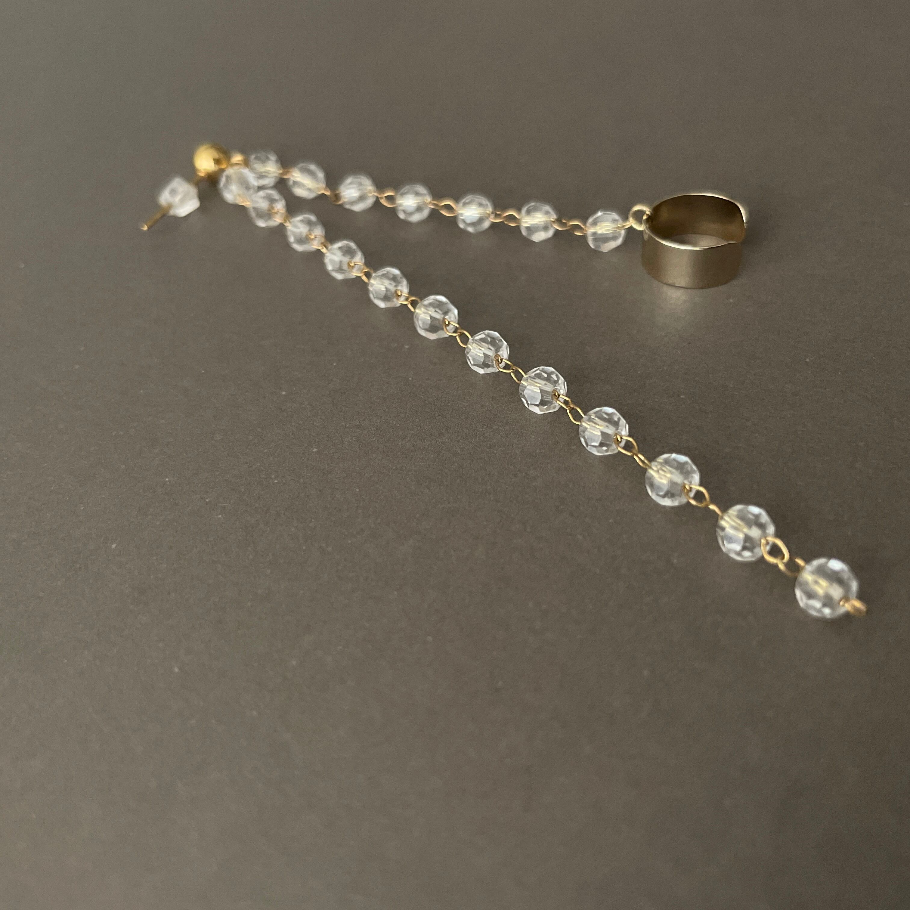 シンプルなイヤーカフにカットの入ったクリアビーズが流れるように揺れるピアス。