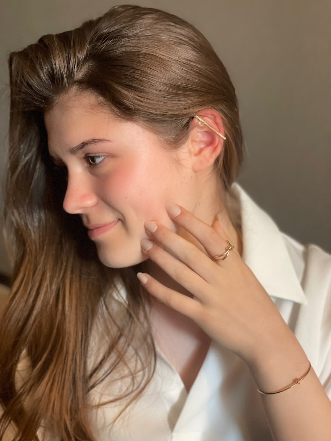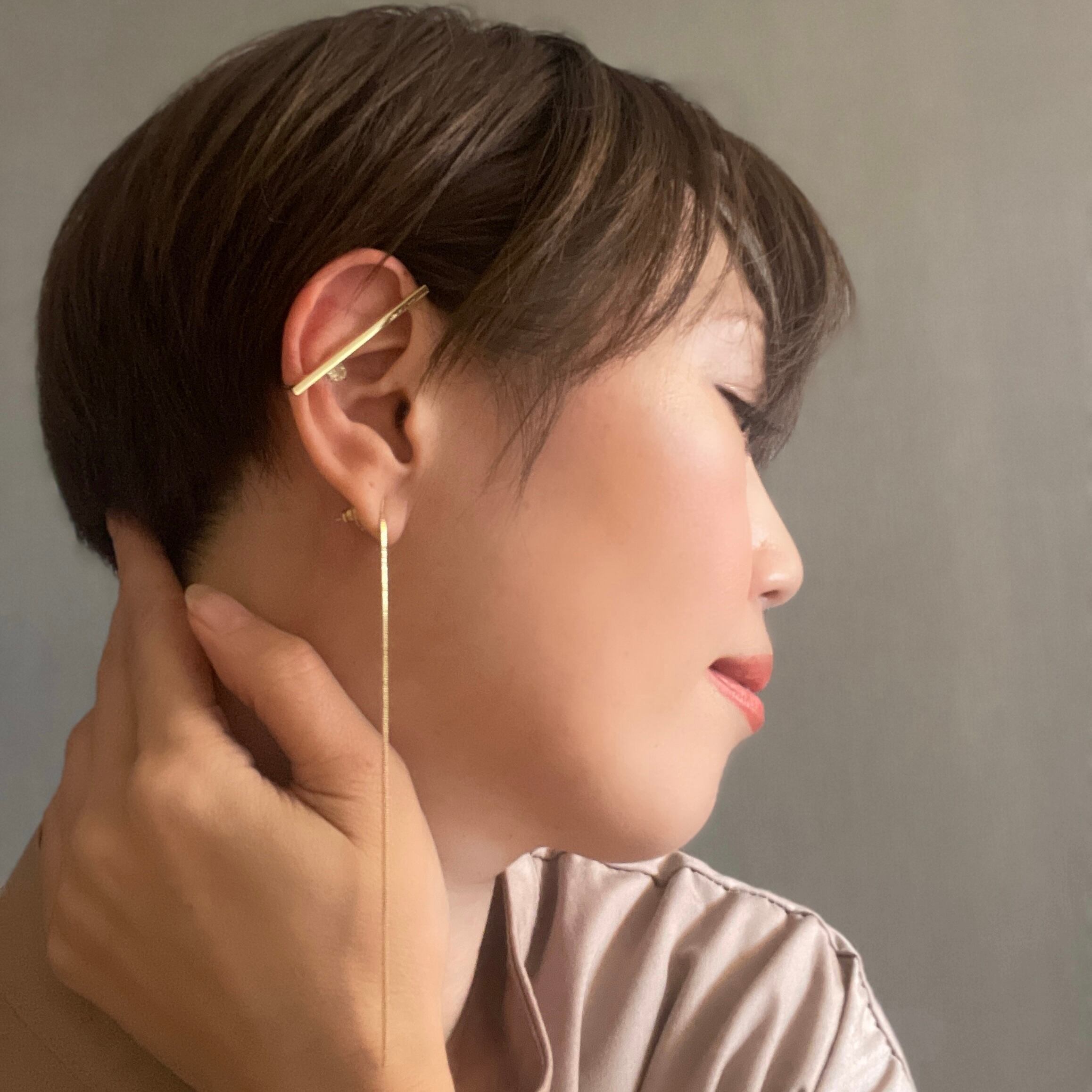 ・(画像3枚目)イヤーカフの3点重ね付けが今っぽい!1粒ジルコニアイヤーカフが耳上にかぶせる珍しい仕様なので、何個も着けても重ならずにおしゃれに魅せられます。