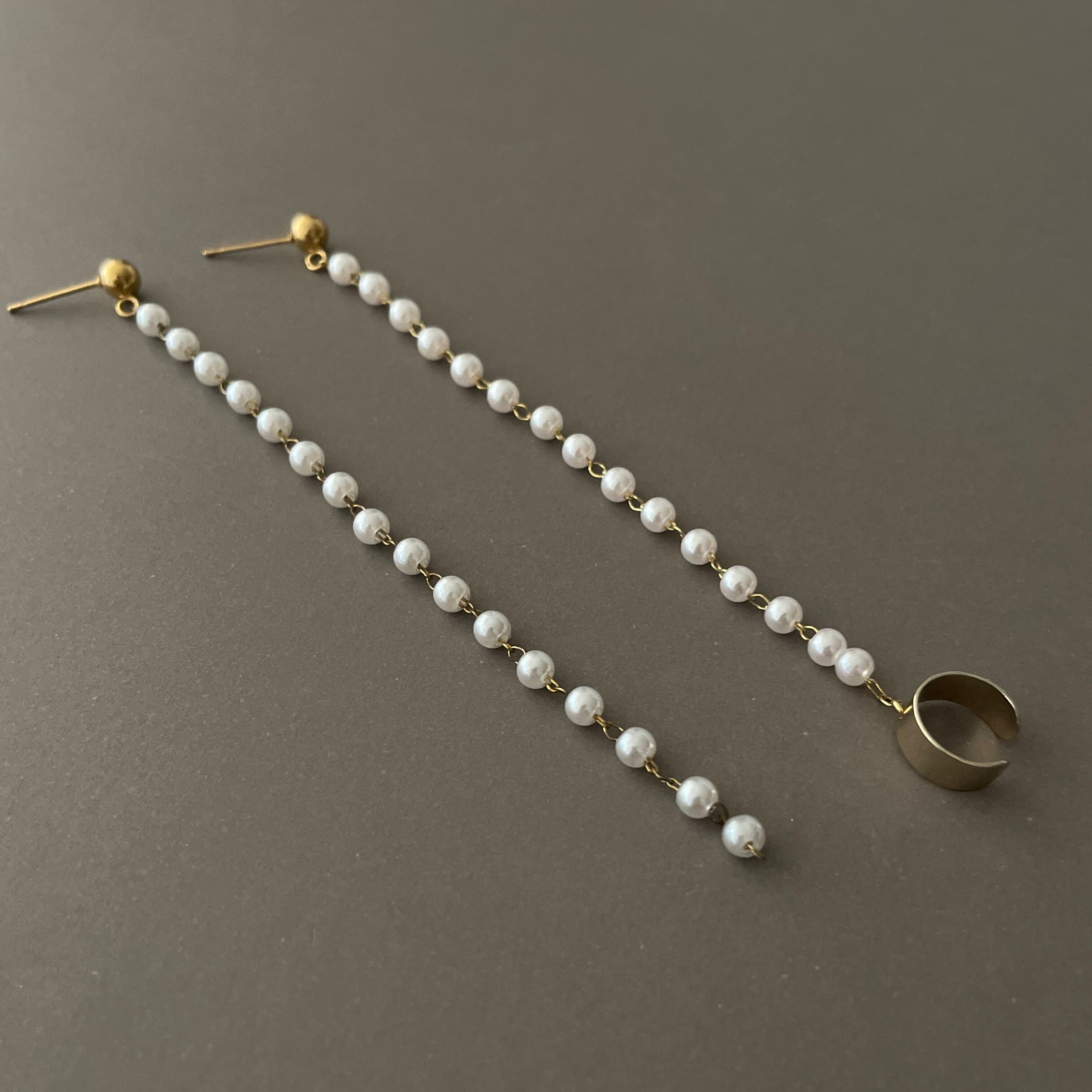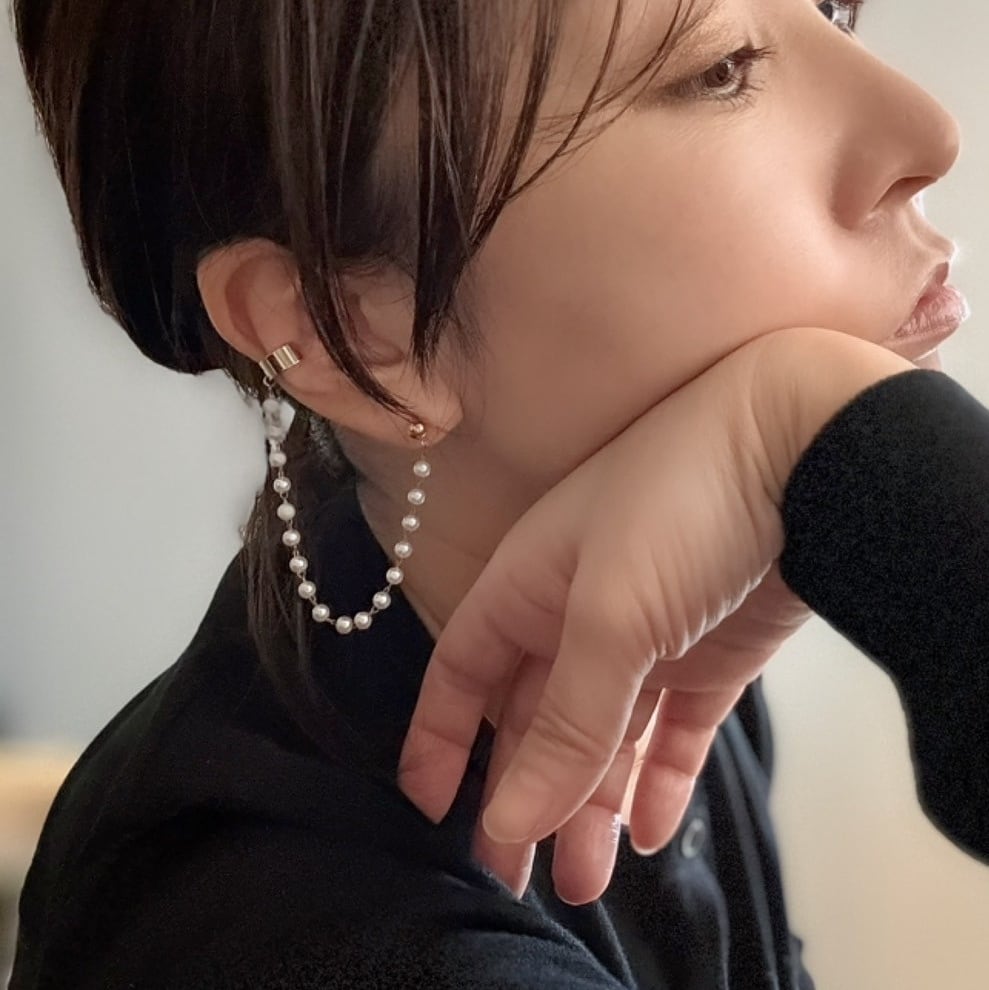 片方はロングパールピアス、もう片方はパールチェーンがイヤーカフについるアシンメトリーピアス