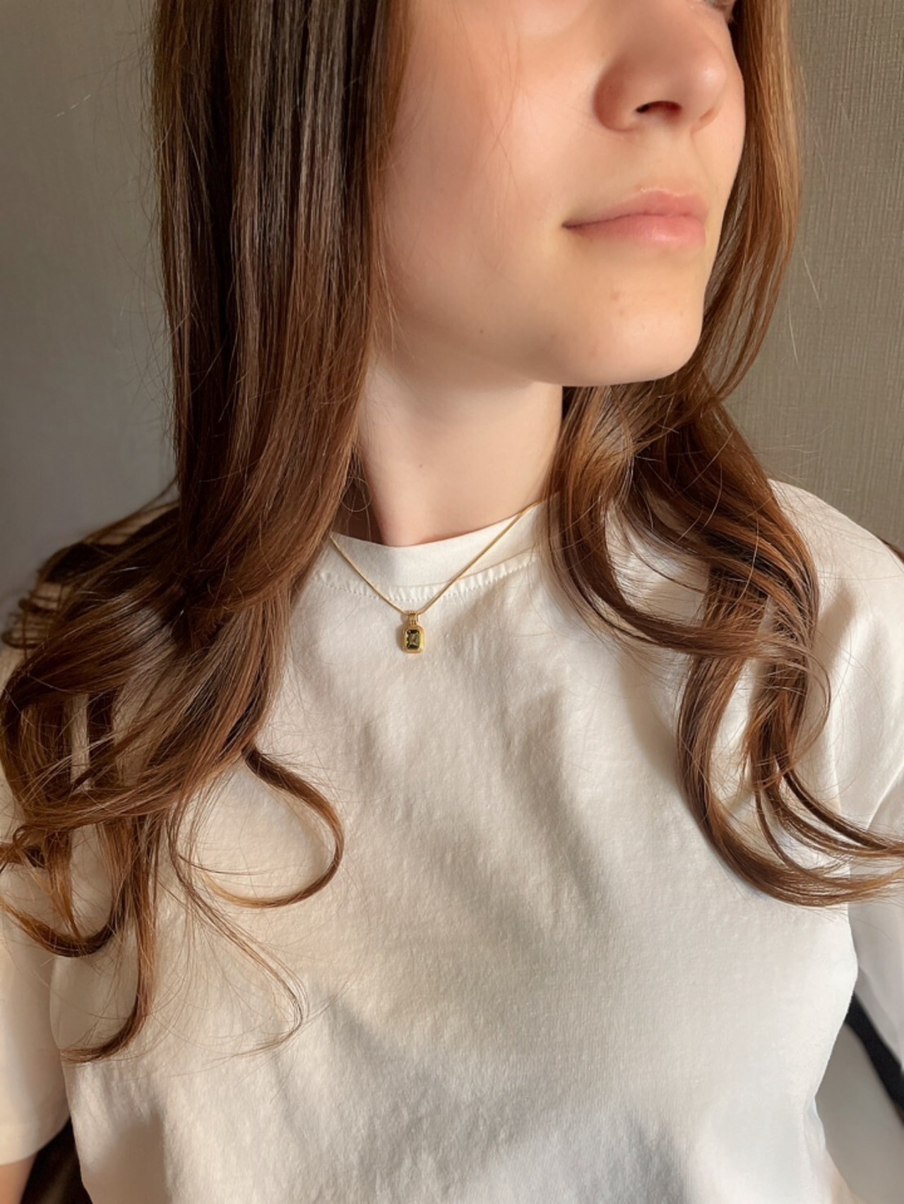 0.8mmの極細スネイクチェーンと、ゴールドのフレームで包まれたイミテーションストーンがアンティークの風合いを醸し出すネックレス。
