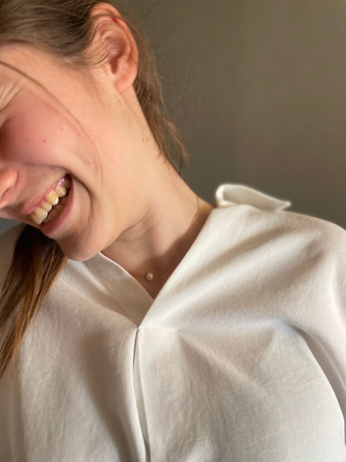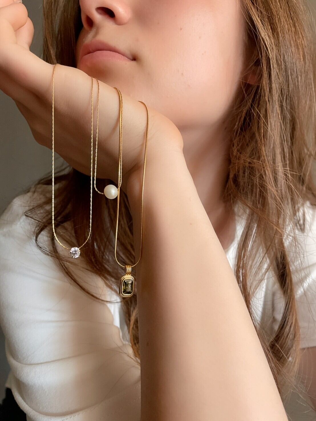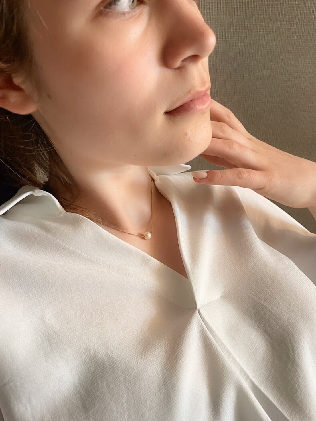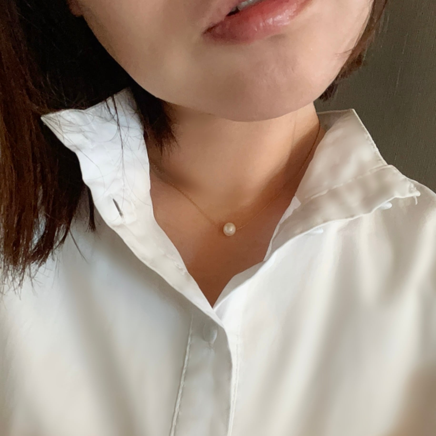 素肌でのご使用時はチェーンの長さを最短でお使いいただくと、デコルテ辺りにパールがきます。