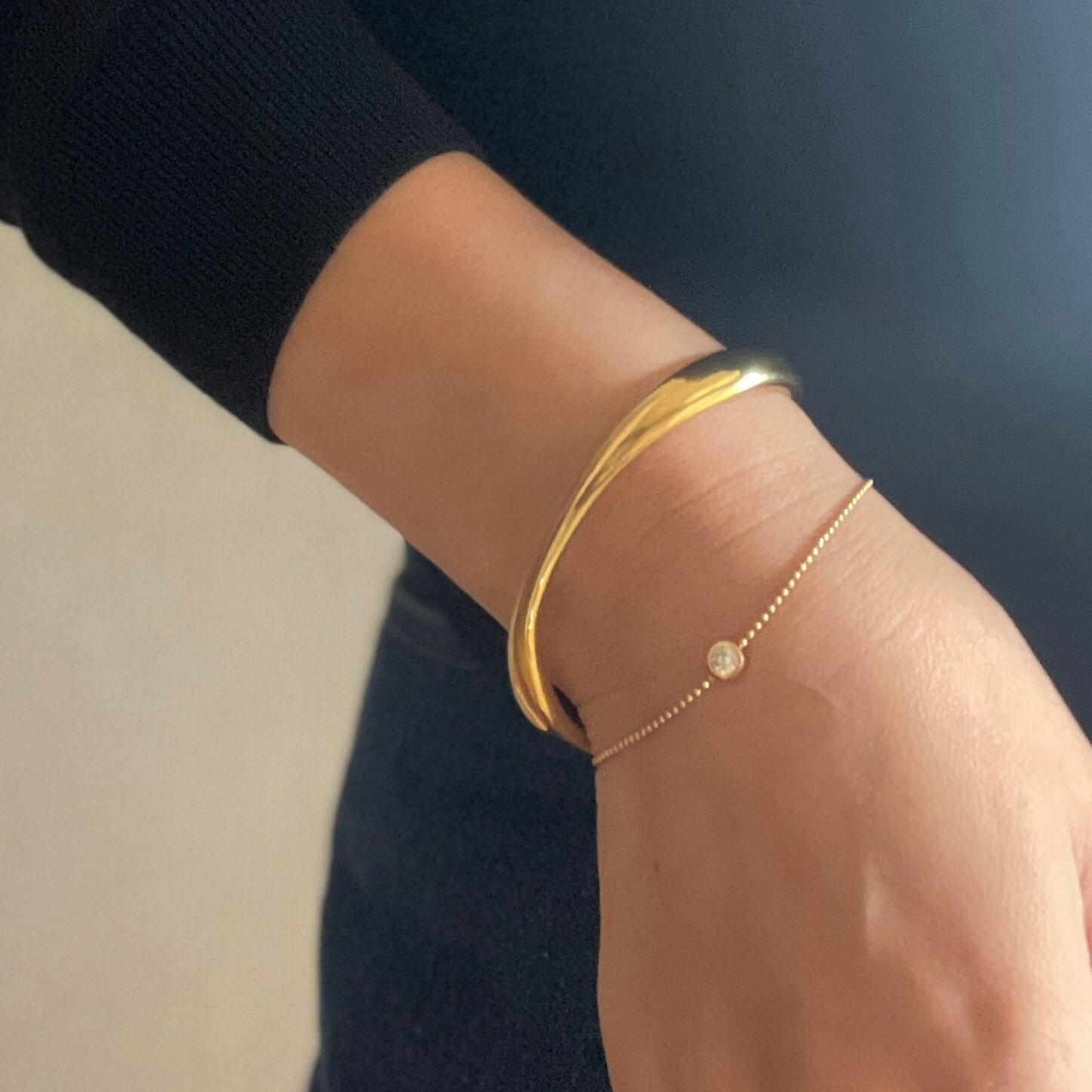 試着したら付け心地が良かったのでこちらのゴールドを買いました。バングルは初めてだったけどとても良いです!重ねづけもしてみたいのでまたお店に行きます。