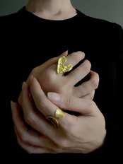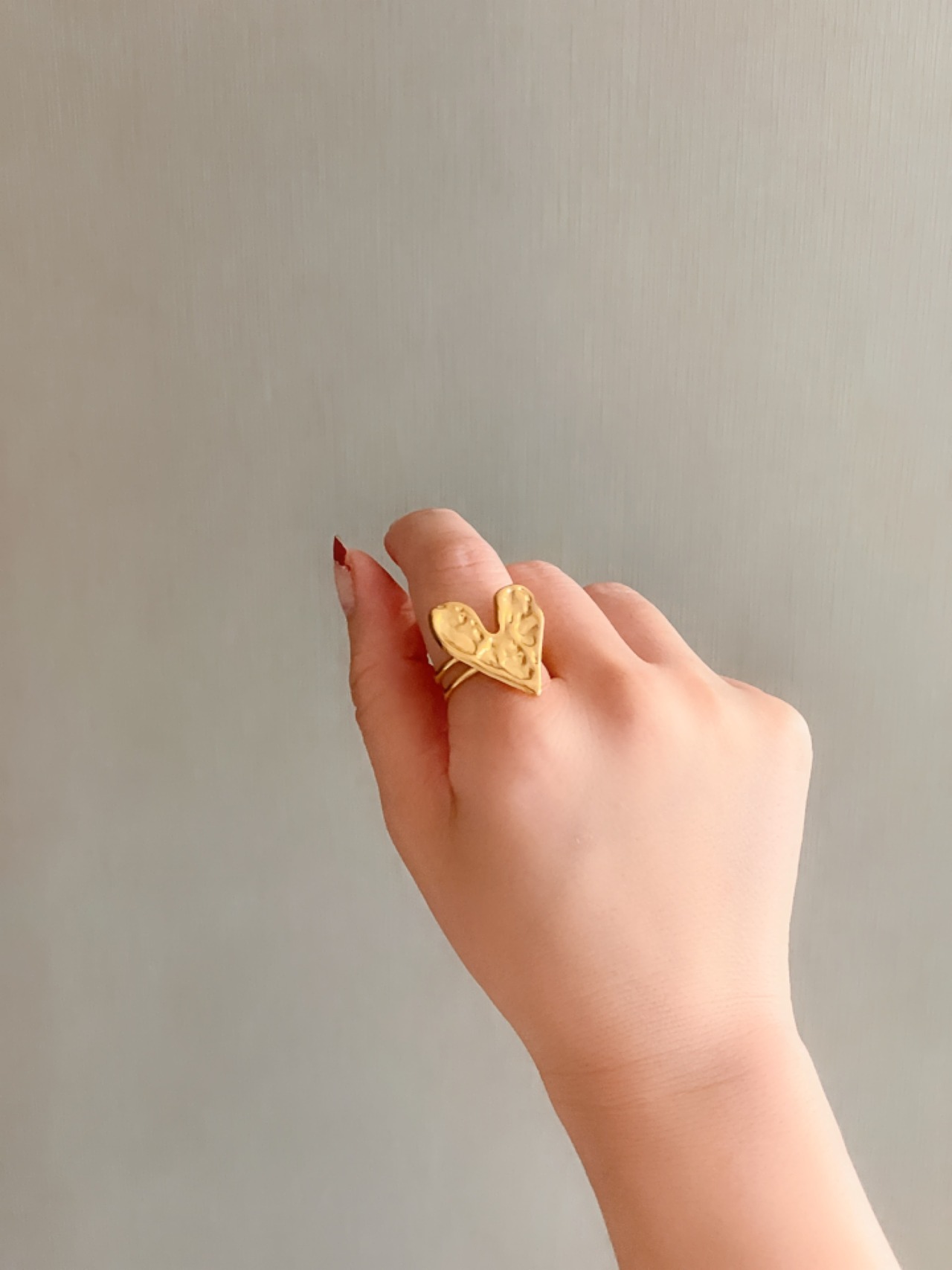 ハートモチーフに槌目加工の様な独特な風合いを施したリング。